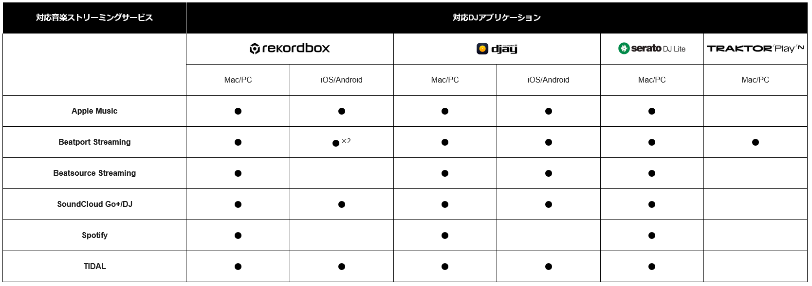 対応音楽ストリーミングサービス:Apple Music、Beatport Streaming、Beatsource Streaming、SoundCloud Go+/DJ、TIDAL