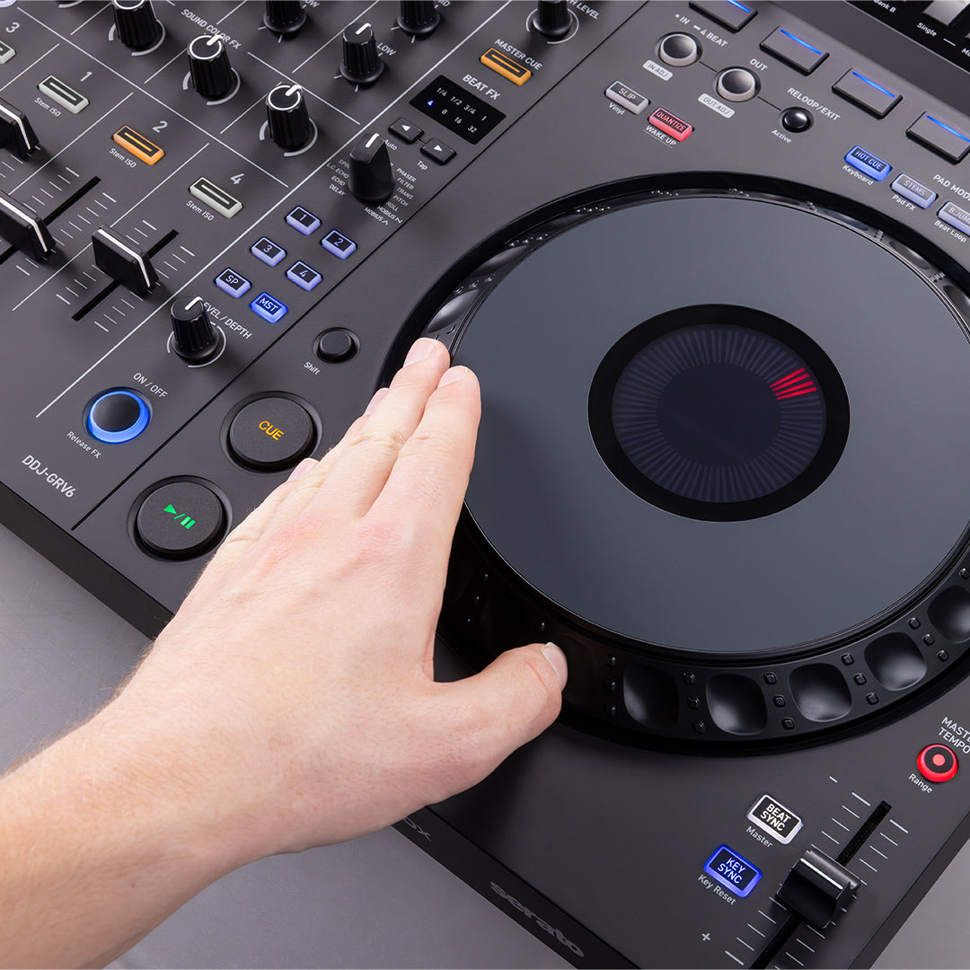 DDJ-GRV6は、マットブラックを基調とし、人間工学に基づくユーザビリティに優れたデザインを採用しています。多彩な機能を備えながらも、必要最小限の表示とインジケーターにより、使いたい機能に直感的にアクセスできます。さらに、DDJ-GRV6の特徴であるGROOVE