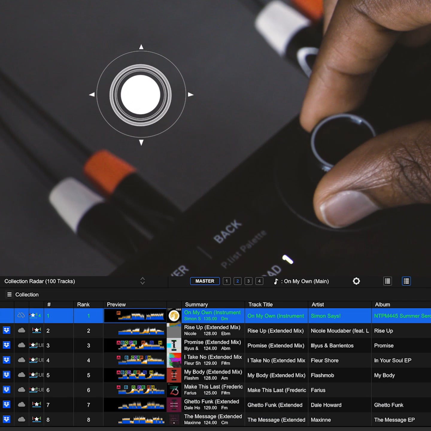 ver.7と組み合わせることで、従来の回転やプッシュ操作に加え、上下左右に倒す操作も可能となりました。左右の操作でメディアブラウザ、ツリービュー、トラックリストを直感的に移動でき、上下の操作でプレイリストやコレクション内を高速に移動できます。これにより、膨大なライブラリの中から目的の曲に素早くたどり着くことができるようになります。
