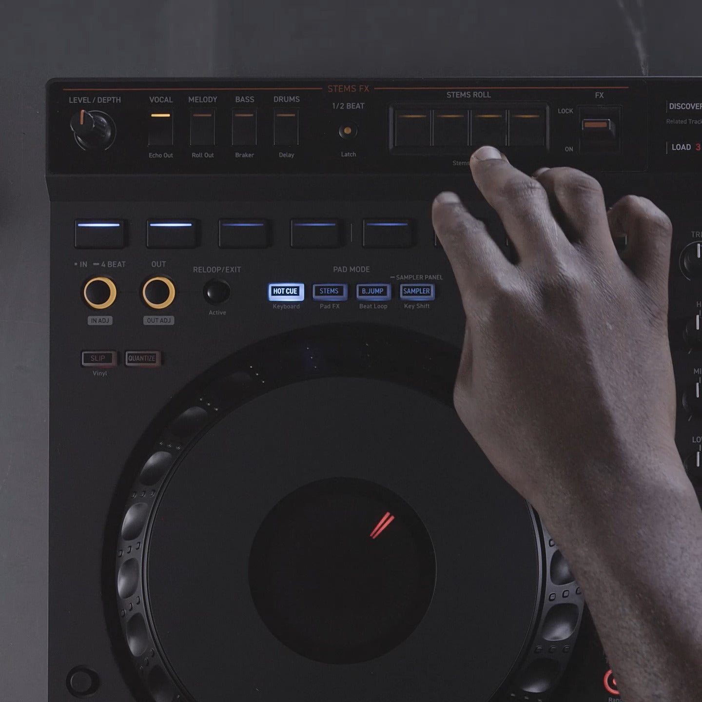 本格的なスクラッチプレイが楽しめる大型ジョグを搭載し、当社フラグシップモデルのマルチプレーヤーCDJ-3000同様にジョグの上部に8個のPERFORMANCE PADSを配置しました。さらに、ミキサー部のBEAT FXにCH SELECTボタンを搭載したことで、現行のクラブスタンダードモデルであるCDJ-3000やDJM-A9の操作マナーでの演奏が可能になります。クラブでの演奏を想定した自由自在なスクラッチプレイと、パッドやエフェクト演奏を融合させたダイナミックなパフォーマンスをお楽しみいただけます。