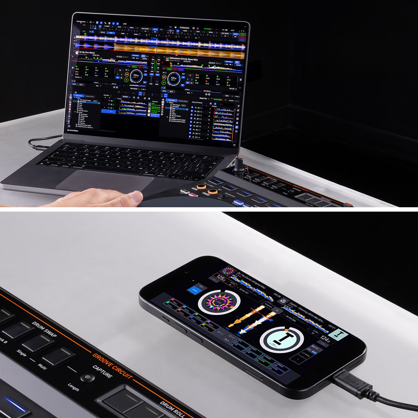 DDJ-GRV6はrekordbox for Mac/Windowsだけでなく、rekordbox for iOS/Androidでの演奏も可能です。モバイルデバイスを接続して、様々なシーンでDJプレイをお楽しみいただけます。